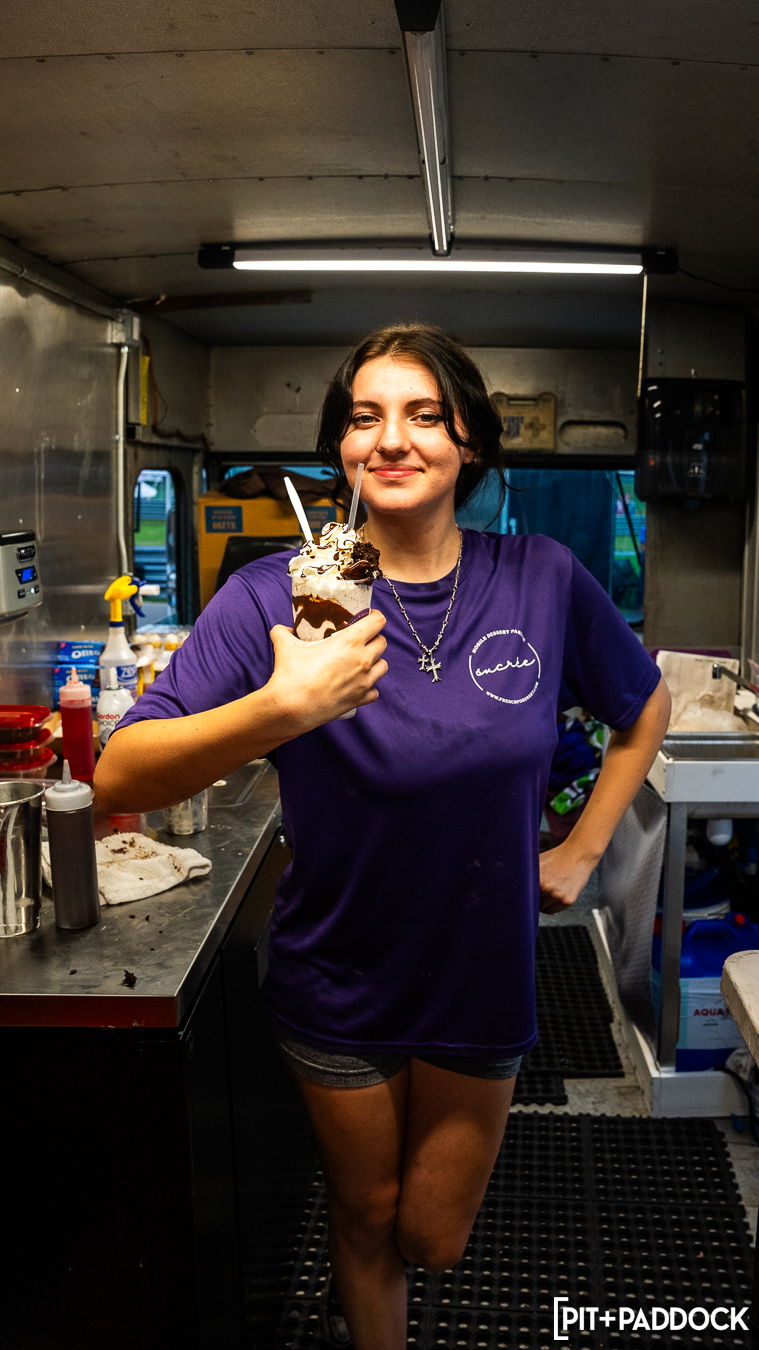After all that walking around, Grid Icons guests found themselves drawn to the two food trucks on-site. Sucrée (French for sweet) made sure Justin and I could cool off from shooting. As someone who misses the Portillos chocolate cake shake, I highly recommend Sucrée’s “Bumpy Cake” as the closest alternative. With our blood sugar replenished, we headed back inside the M1 Concourse ballroom for the hero car walkthroughs.