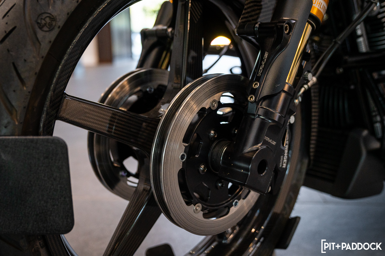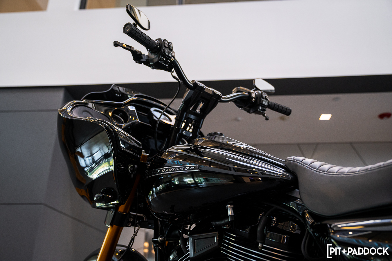 In contrast to the El Diablo, this Road Glide looks like a stealth fighter jet. BST Twin Tek carbon fiber wheels add to the black-on-black scheme while helping shave weight. A Beringer Aerotec 4D quad-disc brake setup was fitted at the same time. These four 230mm rotors offer slightly more braking surface than a single 320mm rotor, but that’s only part of the benefit. It also reduces the gyroscopic effect, which helps riders confidently attack corners on those tight and twisty roads without the bike wanting to stand up. It’s an important consideration on a bike that can hang with the best of them.