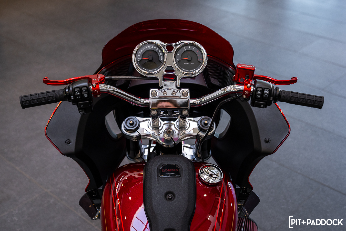 I confess that when I heard Get Lowered Cycles had chromed out an El Diablo, I was nervous. But as soon as it rolled up to Turn 14 Distribution HQ, I have to admit that I think GLC’s treatment makes the bike look way better; all of the mechanical details pop now and play nicely with the factory paint scheme. Lyndall’s Chrome B-52 wheels and chrome/gold rotors visually tie the chrome in across the bike’s beltline, while Arlen Ness Mini Stocker mirrors and chrome Method levers, and Speed-Kings chrome bend bars add some bling up top.