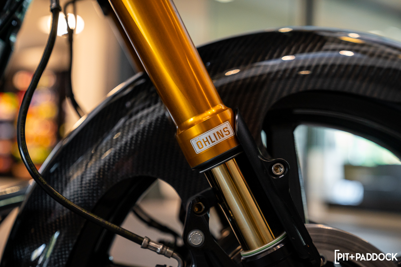 Underneath, GLC ditched the stock front/rear suspension in favor of some Ohlins goodies—FKS 508 in the front and HD 506 in the rear—plus some Custom Cycle radial caliper mounts and gold fork tubes.